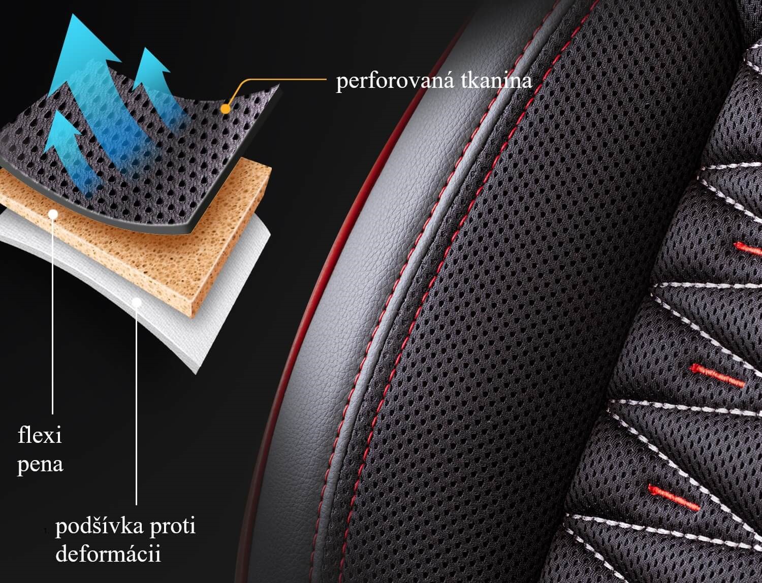 Poťahy sú vyrobené a homologované s ohľadom pre používanie v automobiloch s bočnými airbagmi, ktorých bezpečnosť garantuje certifikát TÜVRheinland AIRBAG. Autopoťahy sú vyrobené z vysoko kvalitných materiálov. Kombinácia kvalitnej perforovanej tkaniny a eko-kože.